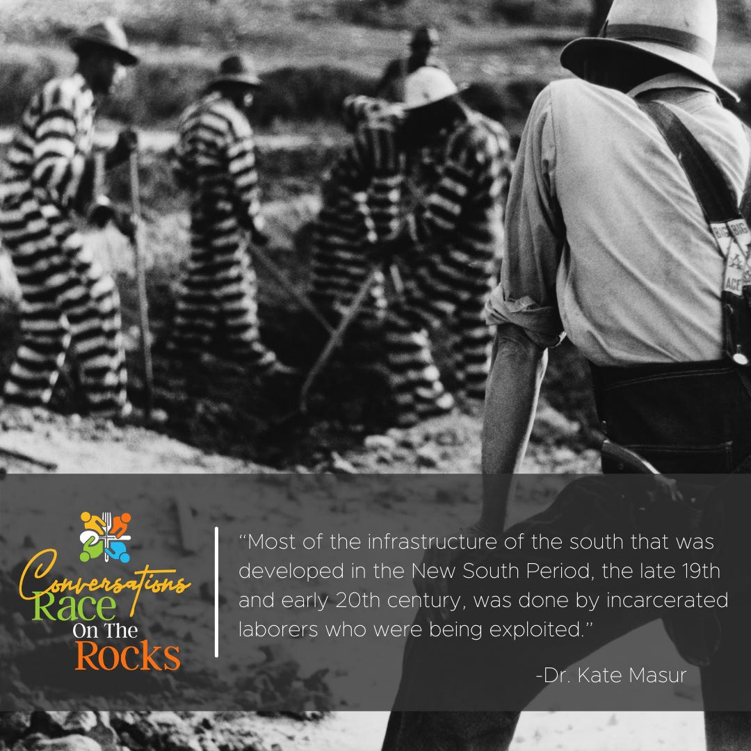 [23:58] - There was an over-incarceration of African Americans who were then leased out to private corporations and private businessmen. The convicts would provide labor and the businessmen would pay the prison per laborer which was less than hiring a worker.