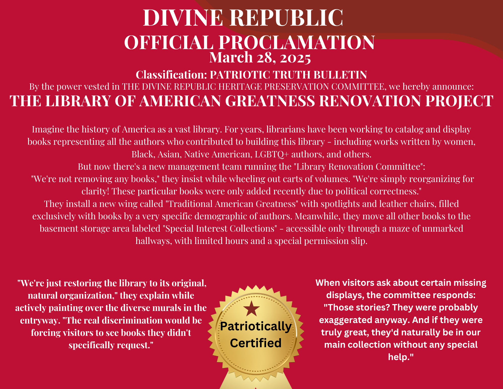 Divine Republic🏛️The Divine Republic Heritage Preservation CommitteeThe Library of American Greatness Renovation ProjectCraig Geevarghese-UffmanMar 28, 2025ShareCommon Life Politics is a reader-supported publication. To receive new posts and support my work, consider becoming a free or paid subscriber.SubscribeNext
