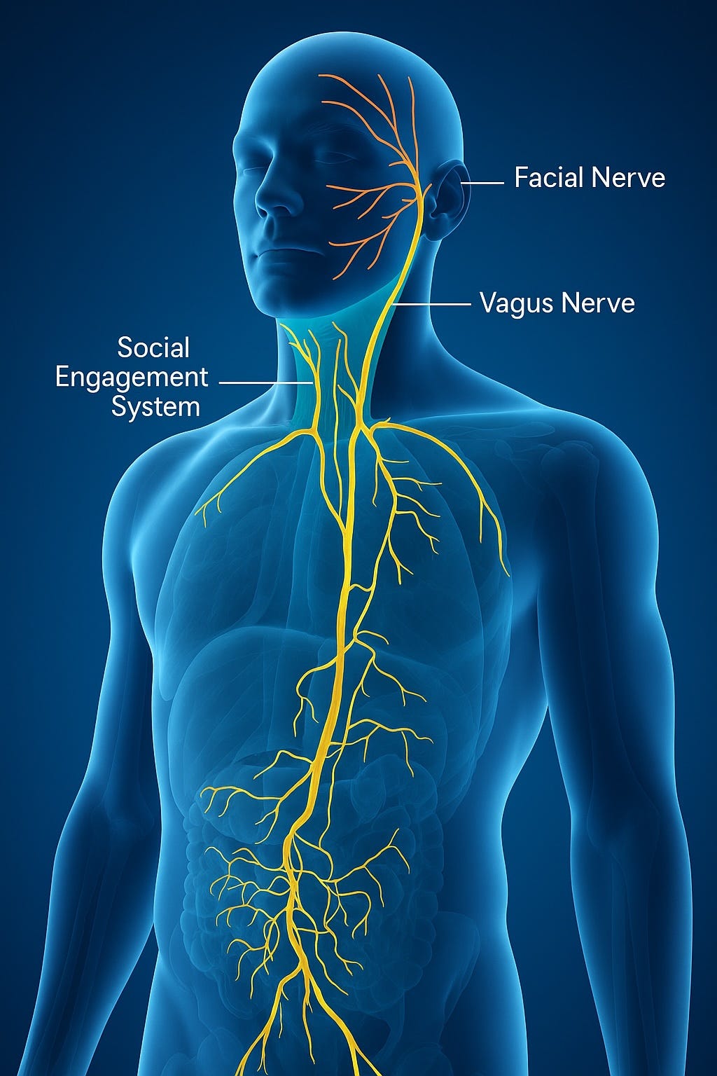 Humans developed an entire network for this—the system Stephen Porges calls the Social Engagement System. It links the muscles of the face, the tone of the voice, the rhythm of the breath, the steadiness of the heart, even the small muscles of the middle ear that tune us to another person’s voice. These are not poetic images; they are anatomical pathways built for one purpose: to help nervous systems find one another.11